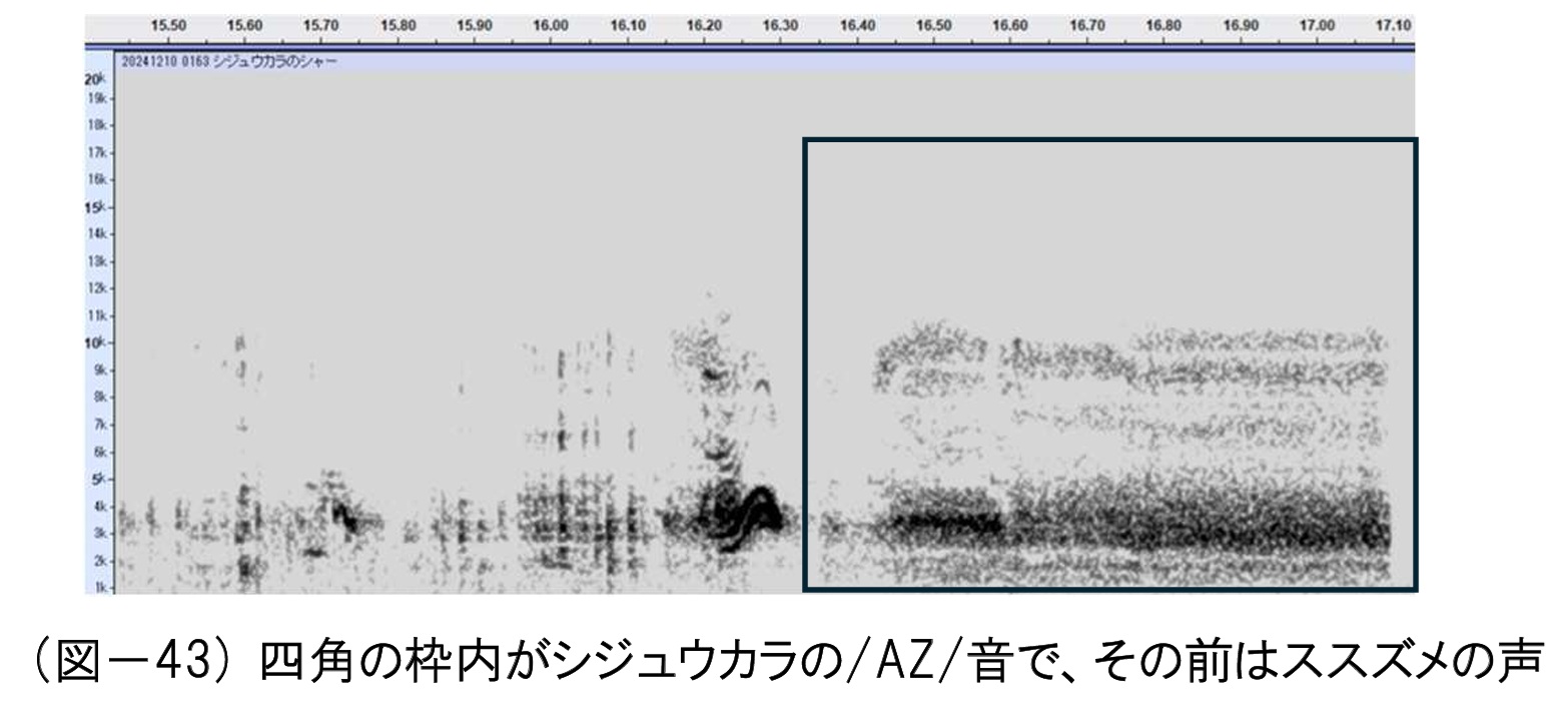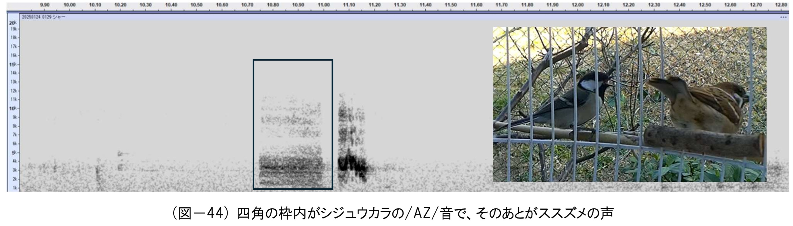 特定の周波数は無く、白色雑音に近い音を出す。スズメだけで はなく、ペアのメスがオスに対してや、餌場でヤマガラに対してなど使用する。状況により発音時間の長短がある。ネコのシャーに類似する。(図- 43.44)